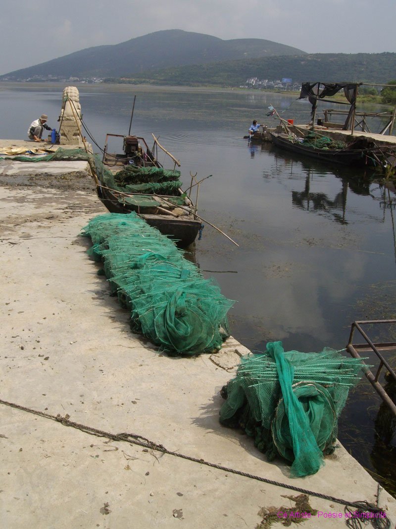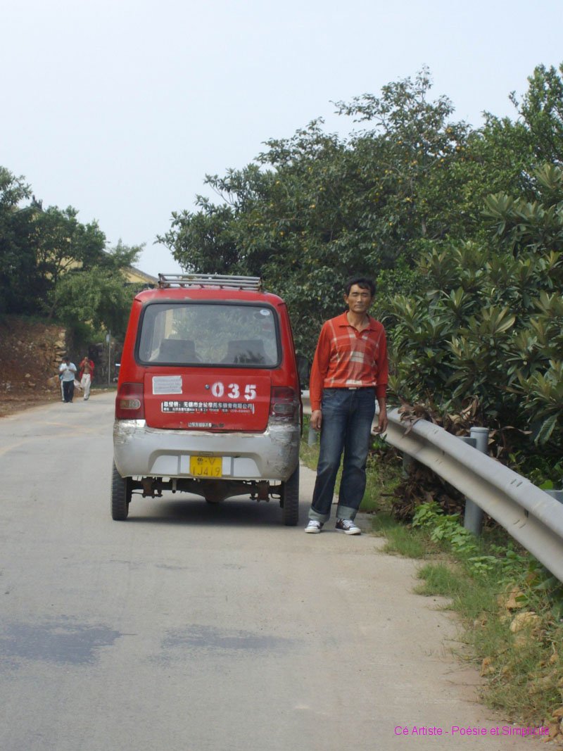 Une partie du lac est divisee et parcelles, utilisees pour elever des crabes particuliers qui sont exportent a Taiwan et Hong Kong, ou ils  sont vendus a prix d’or – qqc comme 20 euros le crabe -. un bonhomme tres rigolo dans une minuscule voiture rouge nous a fait faire  le tour de l’ile. vitesse moyenne : 15 km heure. On voit bien qu’on y prepare un developpement touristique : pont/autoroute en construction, elargissement de la chaussee, construction de maisons de luxe, d’endroits ou vendre des souvenirs, ou faire des restaurants…. Pour susciter le developpement de restaurants, pas de taxes a payer pendant cinq ans pour ceux qui demarrent. Puis 25000 yuans de taxes annuelles pour un restaurant. Cible : les riches shanghaiens (on doit etre a deux heures de Shanghai en voiture).. Pour l’instant tous ces endroits sont vides. Pour l’instant, en semaine c’est calme. Quelques questions a la dame qui vend du the dans son exploitation : pour recolter le the, il y a des travailleurs saisonniers qui viennent d’aussi loin que le Yunnan. Recolte des feuilles de the et des fruits (kakis, mandarines, marrons….) d’avril a juillet.