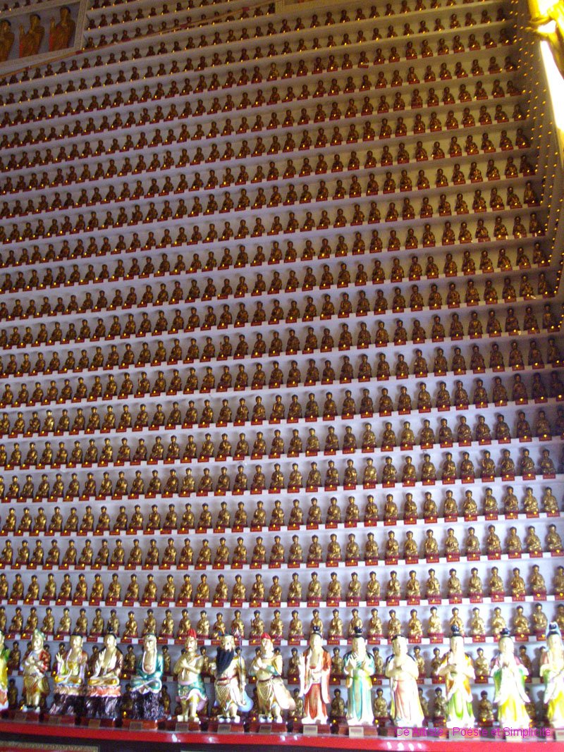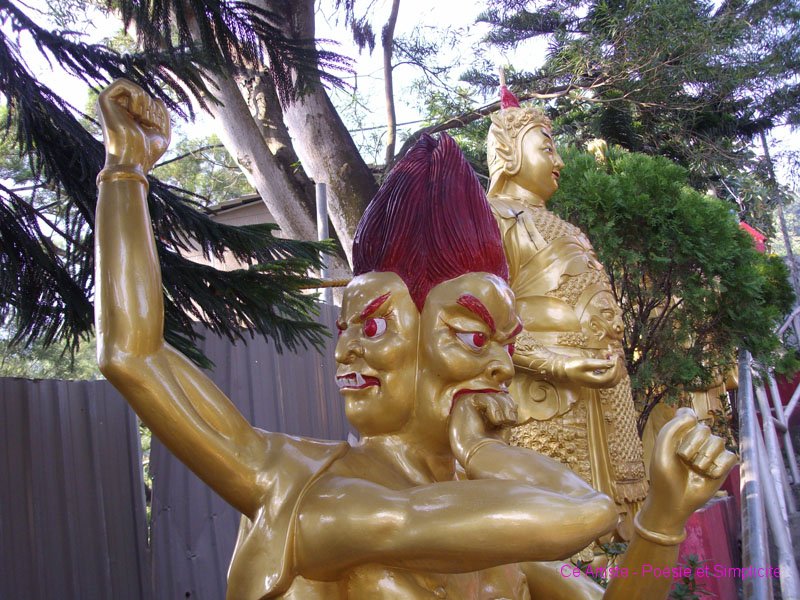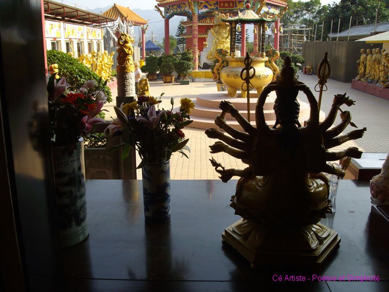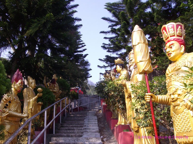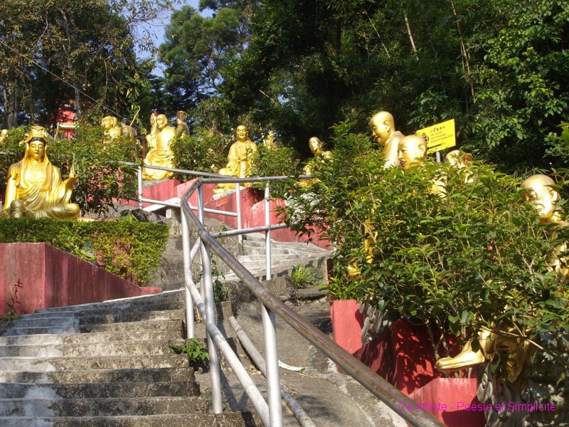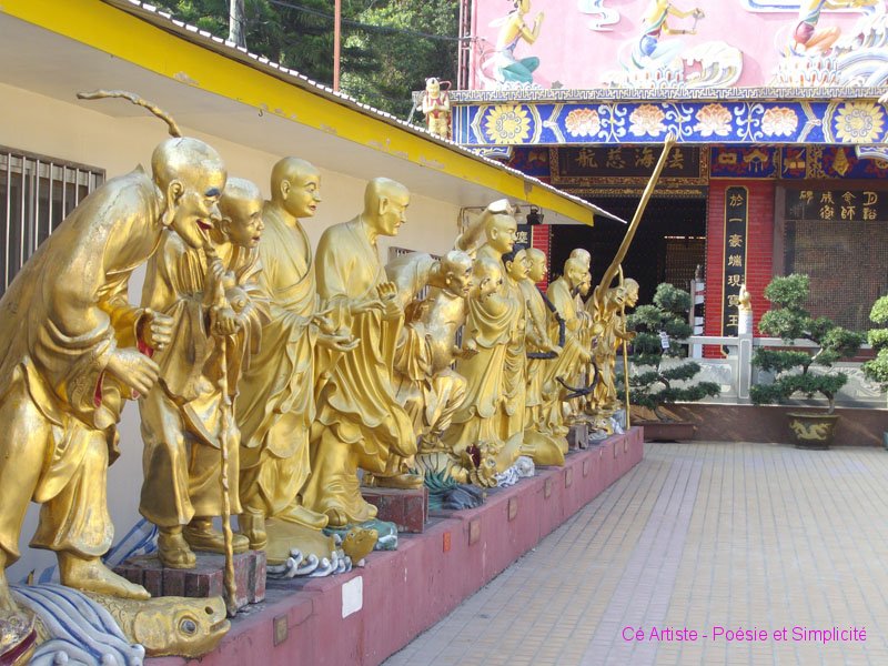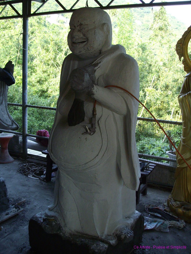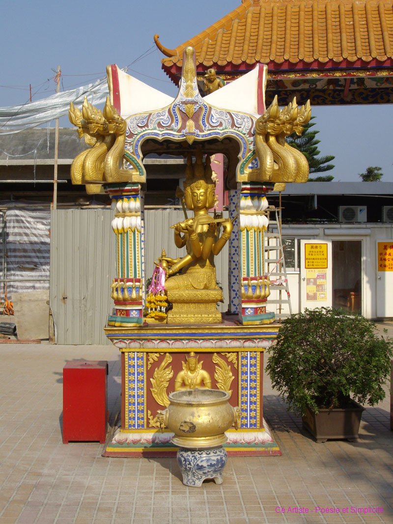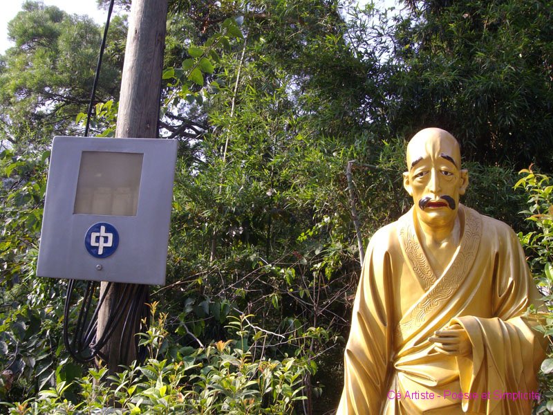 Ensuite, l’album du temple des mille bouddhas, a Sha Tin (nord des territoires de Hong Kong) : des bouddhas dores en pagaille, il y a le coin des hommes et celui des femmes; derrière le temple, la fabrique des statues en armature de fer, puis grillage pour donner du volume, puis ciment. Je n’ai pas été témoin de la phase peinture. Comme bien entendu tout est extrêmement codifié, les modèles auxquels il faut se référer sont représentés sur des feuillets, auxquels les sculpteurs se conforment. Et, au milieu de tout ça, un petit temple – un simple autel, presque- qui a l’air de n’avoir rien a faire avec le bouddhisme / un petit gars dans un fauteuil – un trône ? – …. et les fleurs offertes ramassées, presque fanées, prêtes a brûler… Il y a un bouddha au tuyau d’arrosage, et un bouddha au compteur électrique.