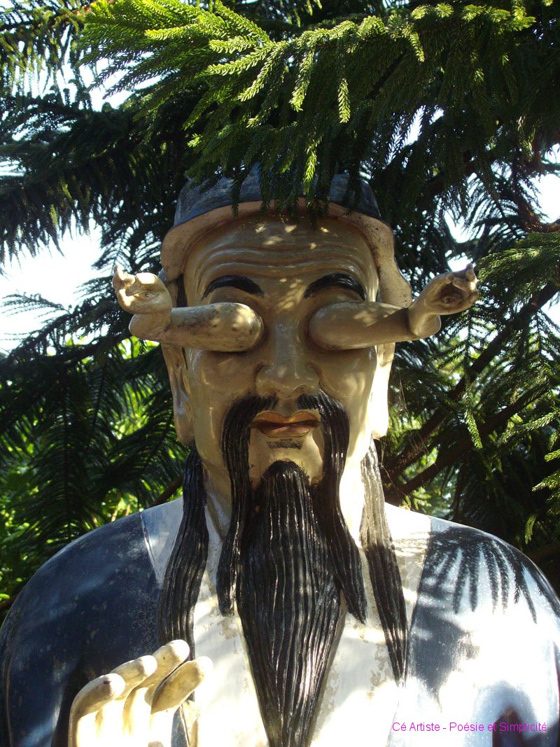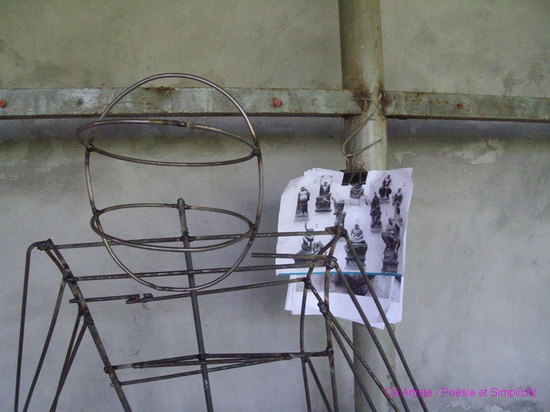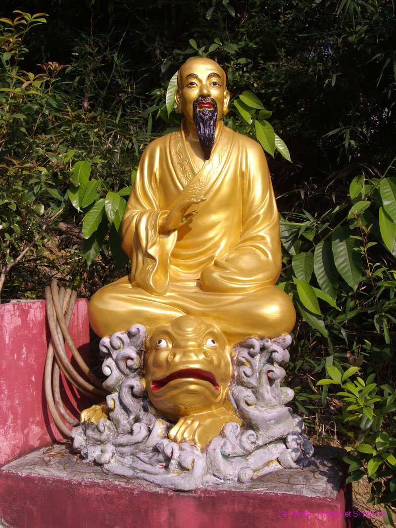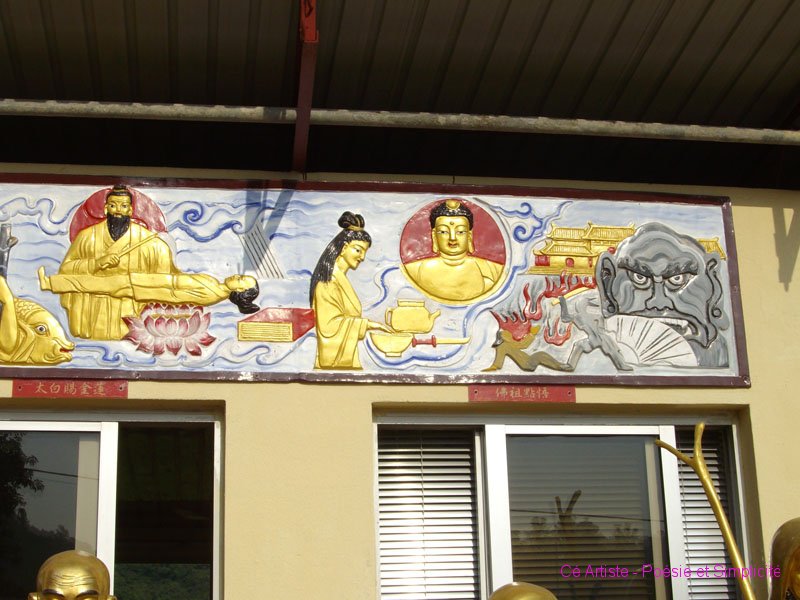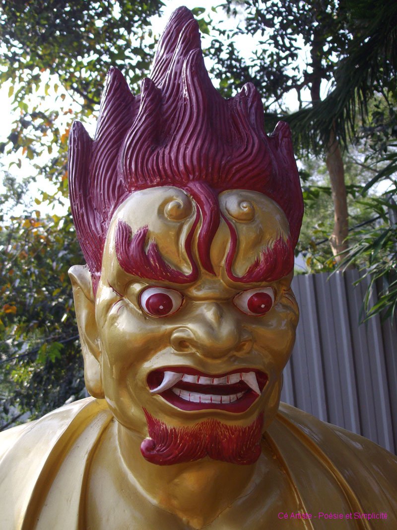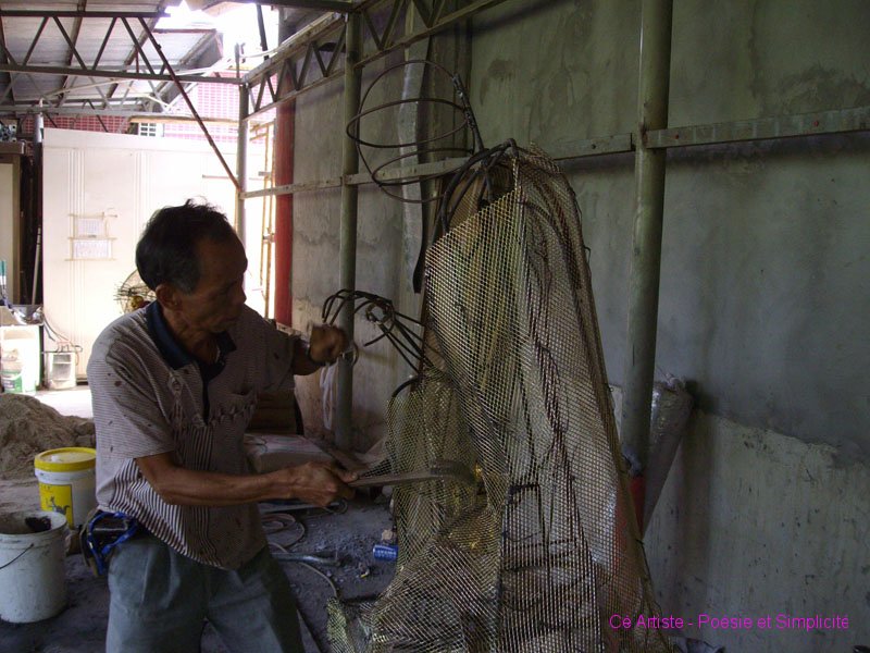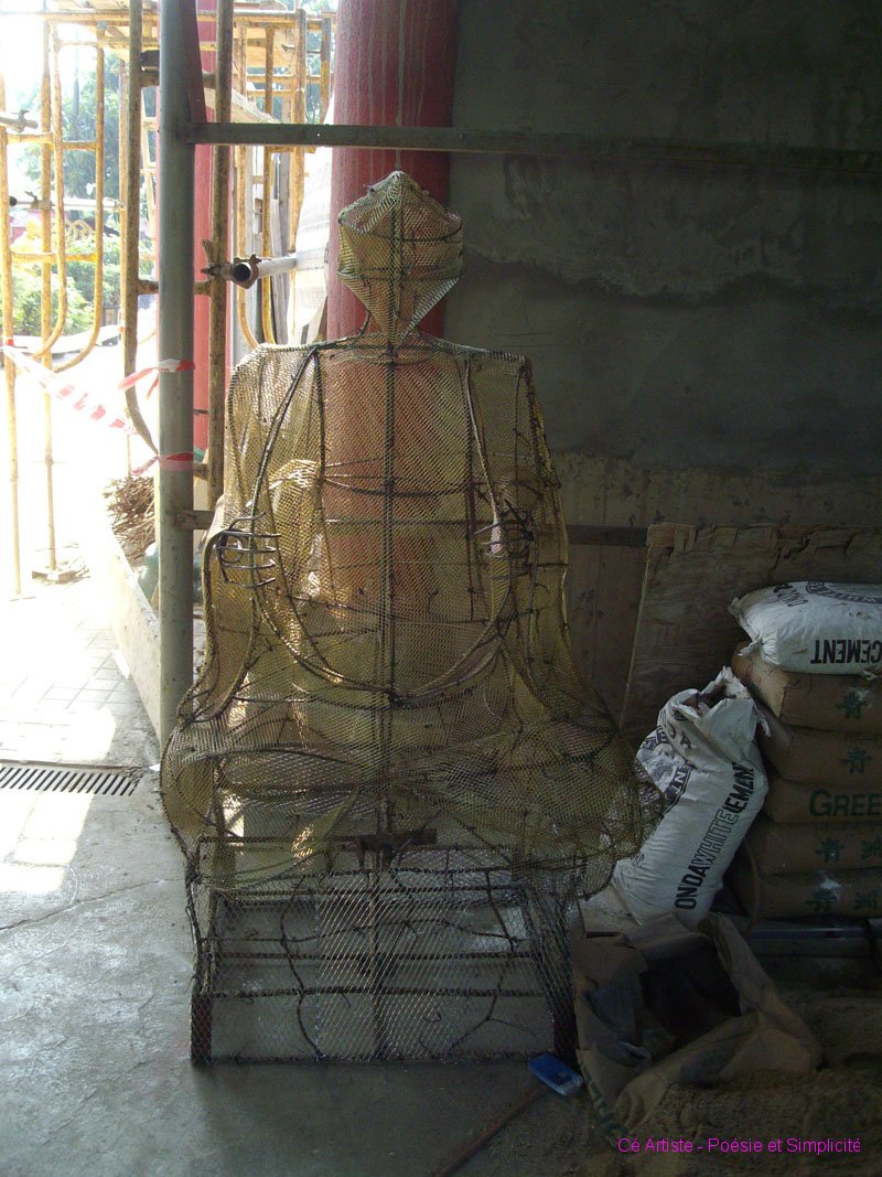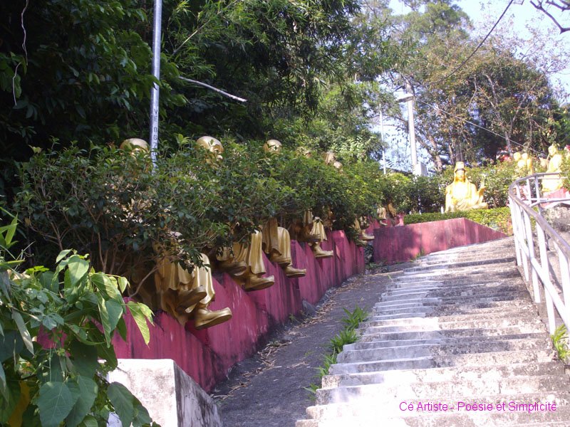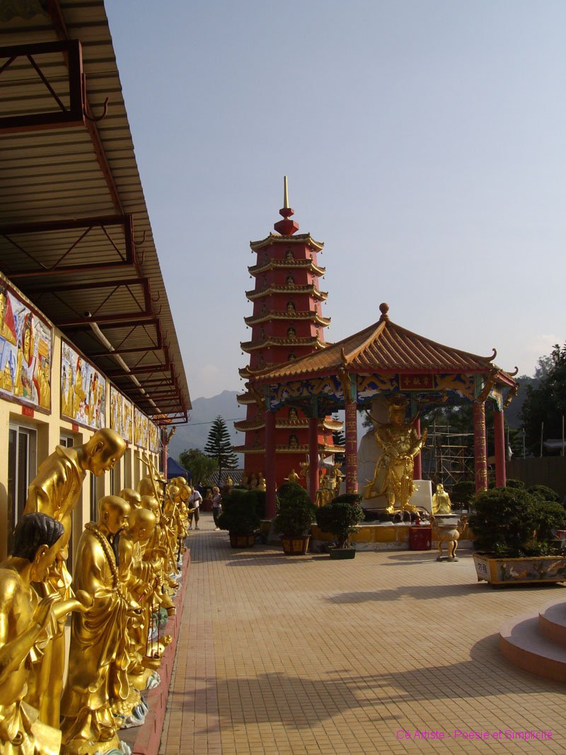 Ensuite, l’album du temple des mille bouddhas, a Sha Tin (nord des territoires de Hong Kong) : des bouddhas dores en pagaille, il y a le coin des hommes et celui des femmes; derrière le temple, la fabrique des statues en armature de fer, puis grillage pour donner du volume, puis ciment. Je n’ai pas été témoin de la phase peinture. Comme bien entendu tout est extrêmement codifié, les modèles auxquels il faut se référer sont représentés sur des feuillets, auxquels les sculpteurs se conforment. Et, au milieu de tout ça, un petit temple – un simple autel, presque- qui a l’air de n’avoir rien a faire avec le bouddhisme / un petit gars dans un fauteuil – un trône ? – …. et les fleurs offertes ramassées, presque fanées, prêtes a brûler… Il y a un bouddha au tuyau d’arrosage, et un bouddha au compteur électrique.