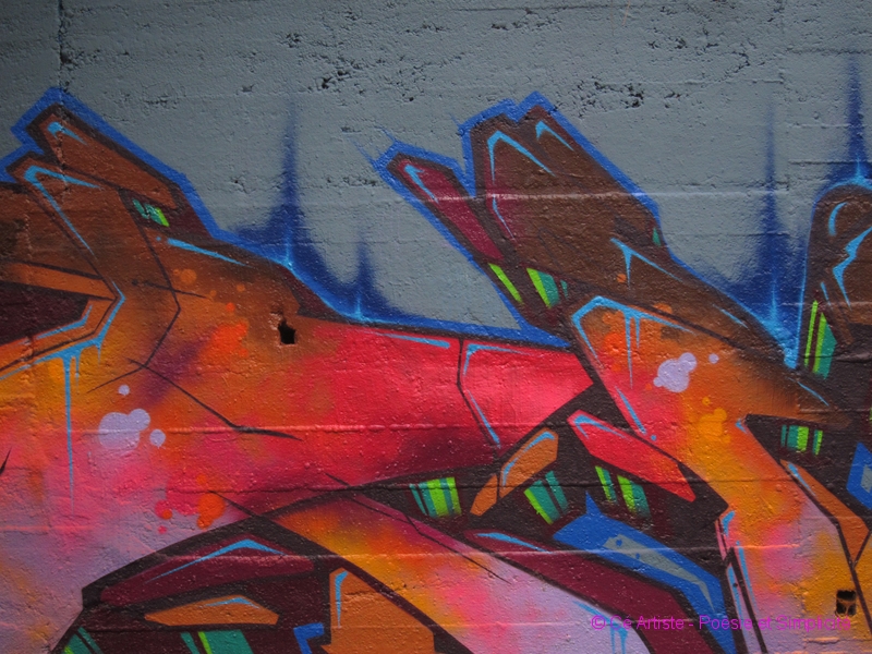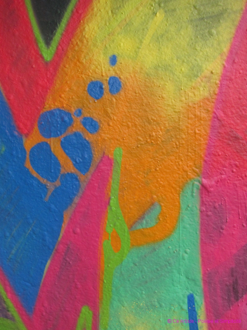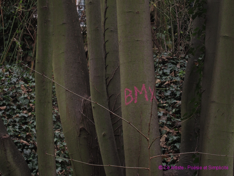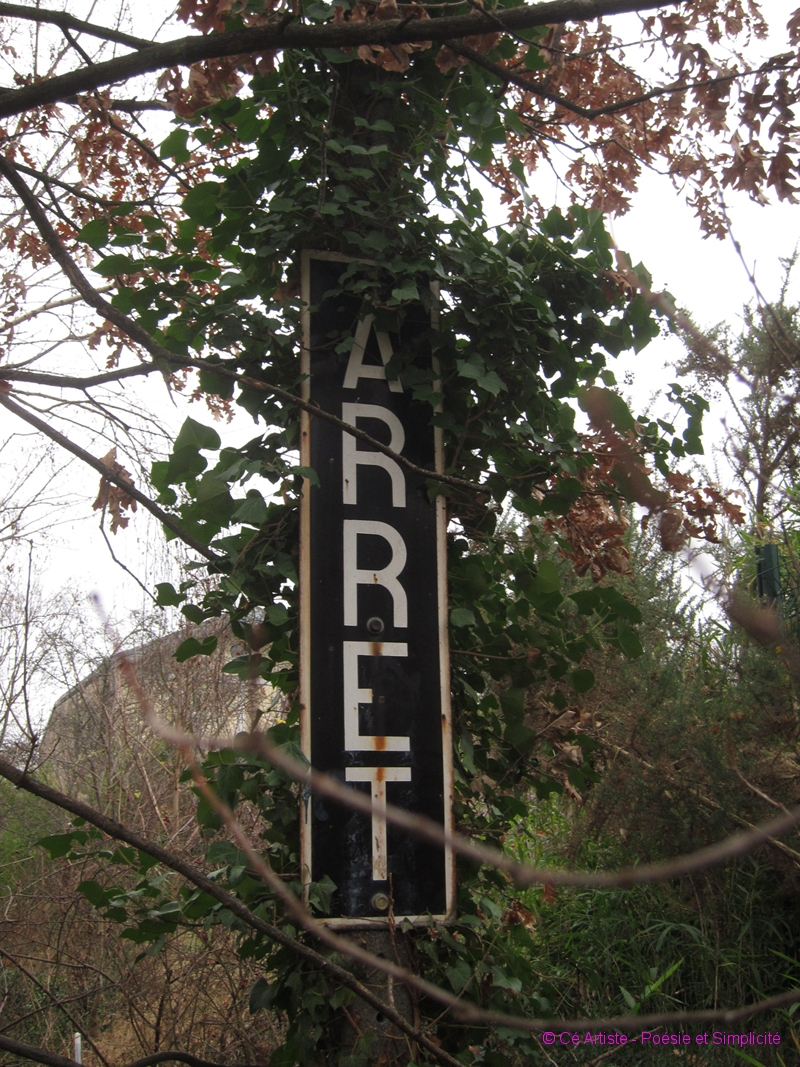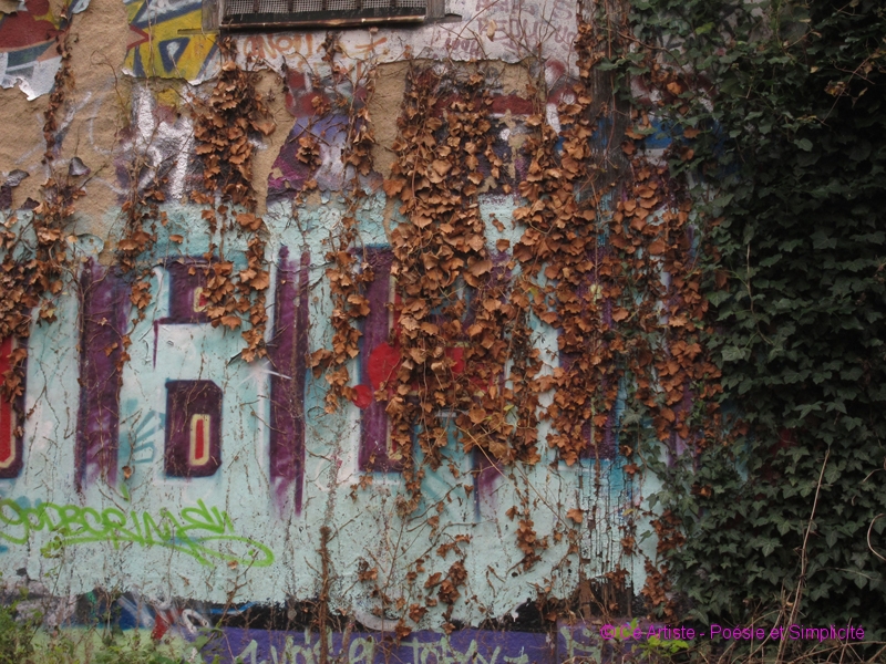 Sur la voie ferrée désaffectée, la nature reprend ses droits et les humains l’investissent différemment : graffitis, sentier écologique et éducatif…Graffitis tous frais de la nuit, lichens et lierre. Les mésanges nous accompagnent.