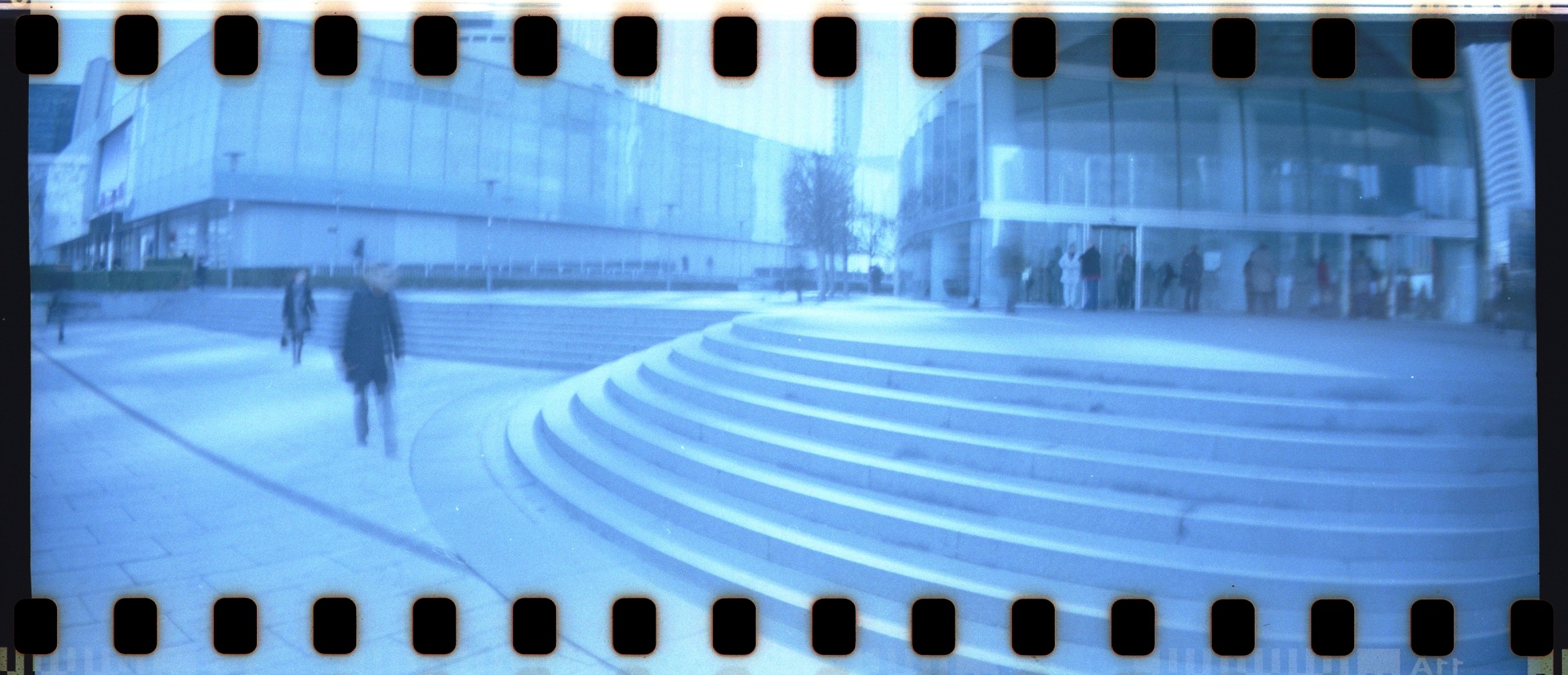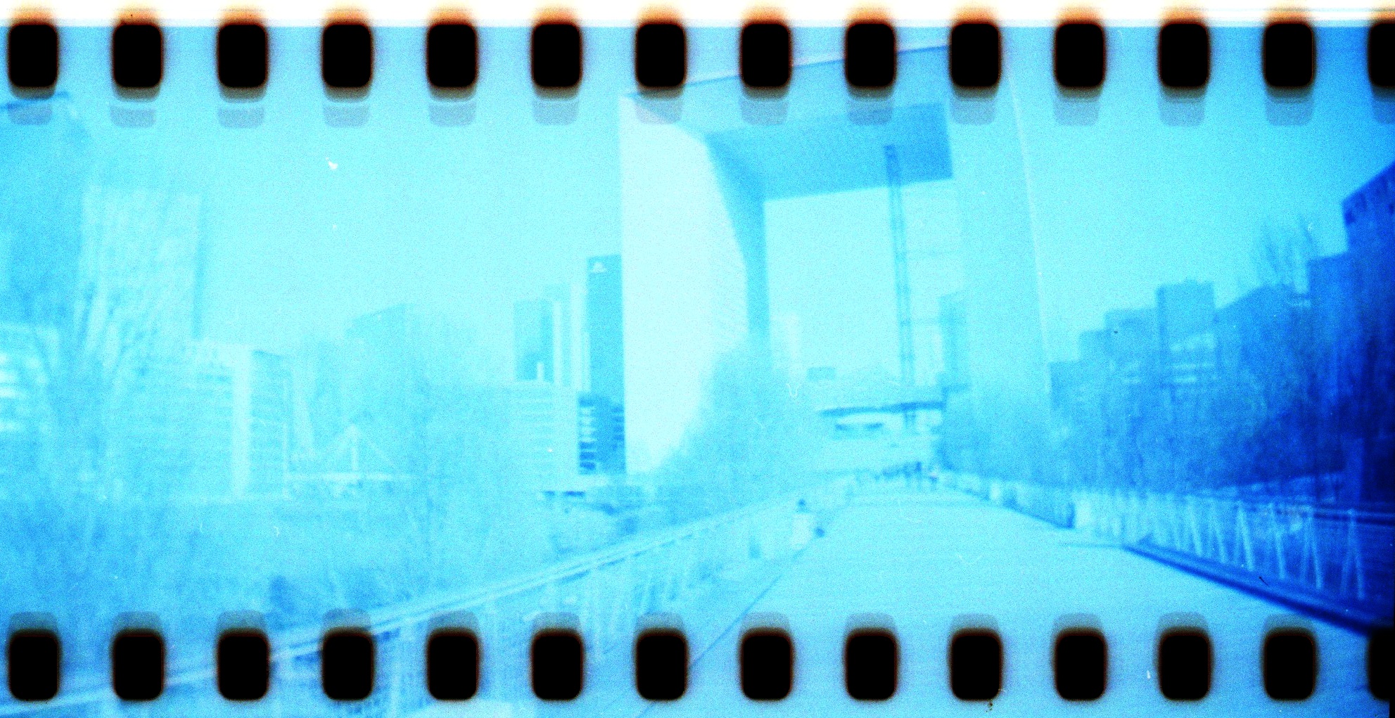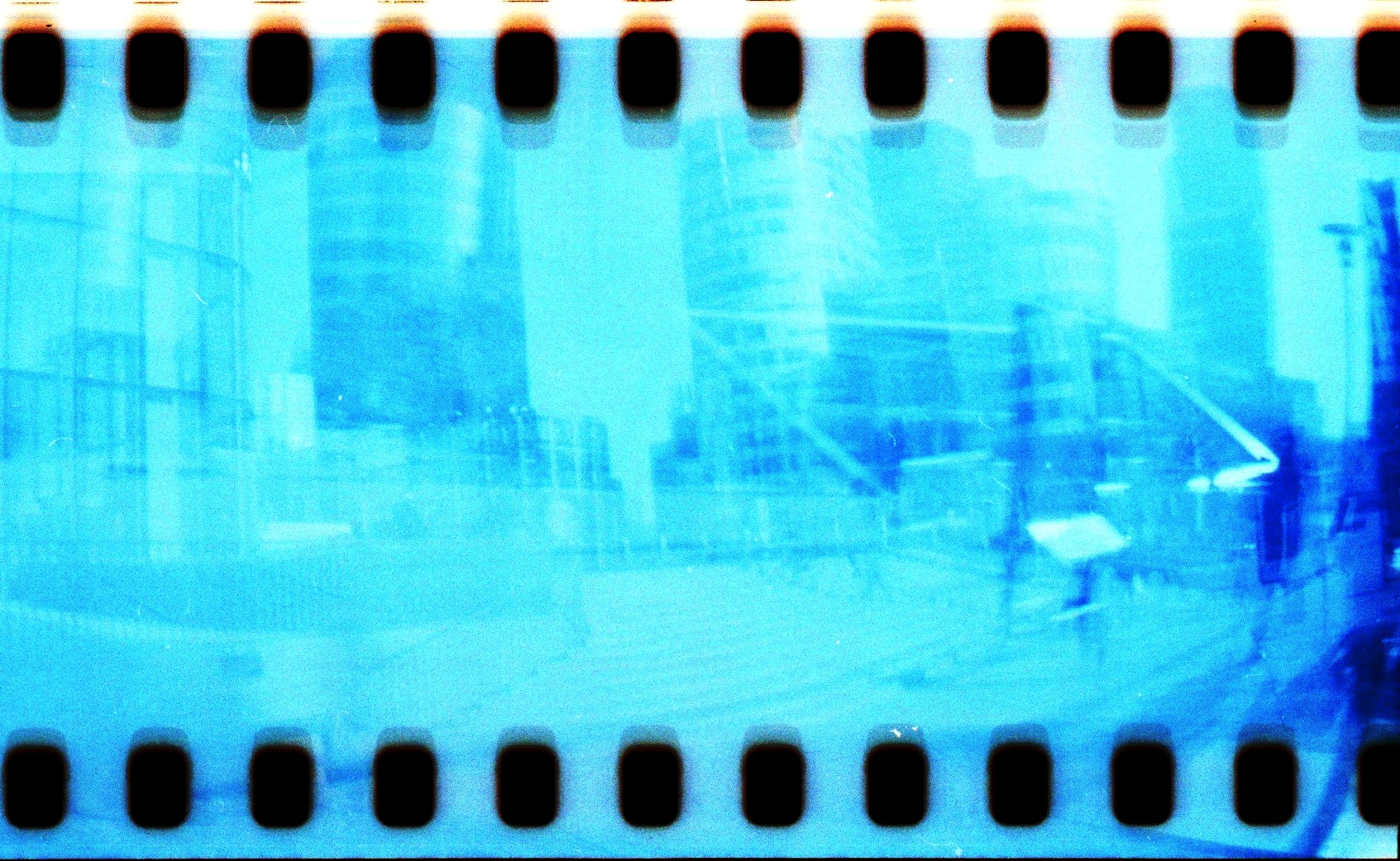 Me voilà partie pour la Défense donc, équipée de mes appareils : un qui fait des photos numériques, l’autre argentiques. j’ai pris une pellicule périmée, et du coup mon lomo voit la vie en bleu..