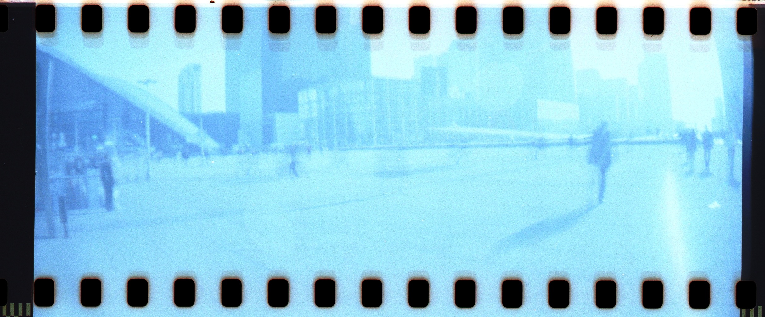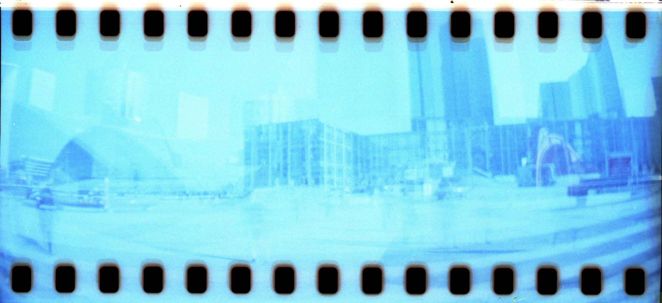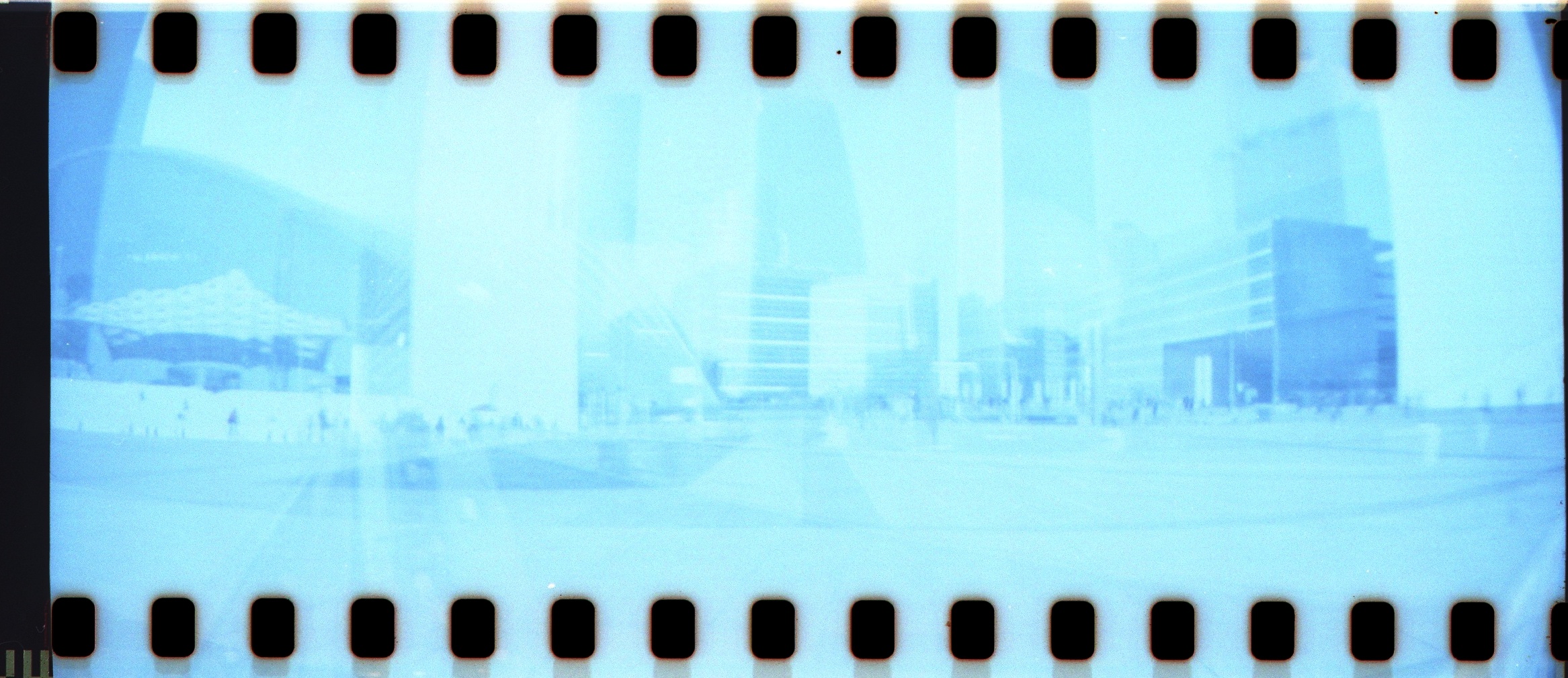 Me voilà partie pour la Défense donc, équipée de mes appareils : un qui fait des photos numériques, l’autre argentiques. j’ai pris une pellicule périmée, et du coup mon lomo voit la vie en bleu..
