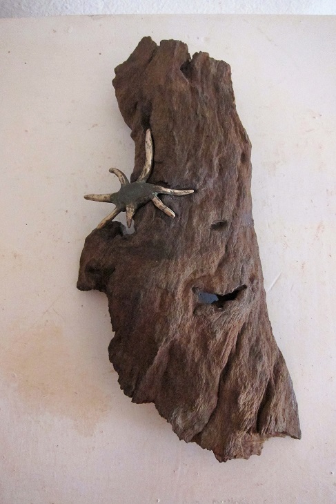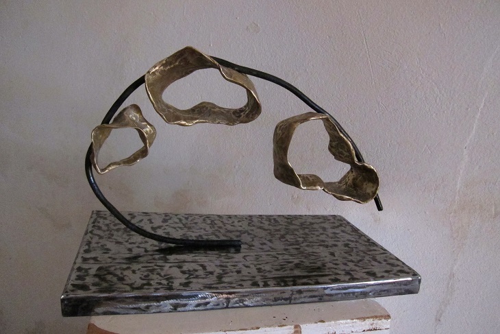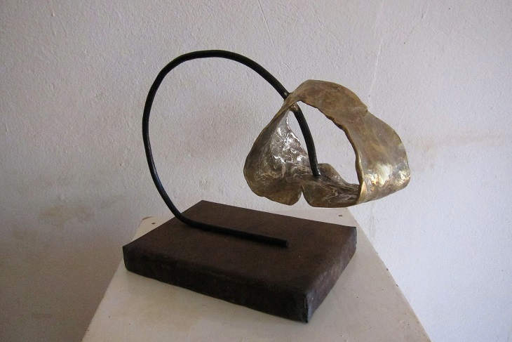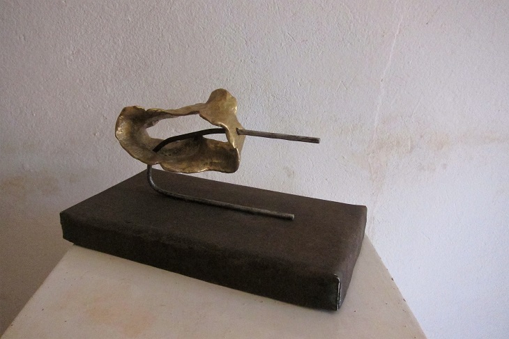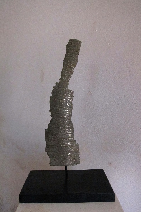 Les réalisations de cette fois-ci ont été placées sous le signe de la rencontre entre les matières : j’ai utilisé des matériaux existants – carton, écorce, corne …qui ont nécessité pour certains de faire des moules puis des tirages en cire. La fonte  a mobilisé toutes les énergies et toutes les compétences. Une autre série de sculptures a demandé de travailler le bronze et le fer en association après la fonte , en élaborant la sculpture pas à pas à mesure que son assemblage avançait. Les socles ont été réalisés en métal toujours avec le concours de la belle équipe qui a trouvé les plaques de tôle, et les artisans pour réaliser les socles. Pour quelques sculptures, il a fallu réfléchir à une manière de fixer la sculpture au socle, et c’est l’ensemble de nos réflexions qui a permis de trouver la solution….une sélection des sculptures :
