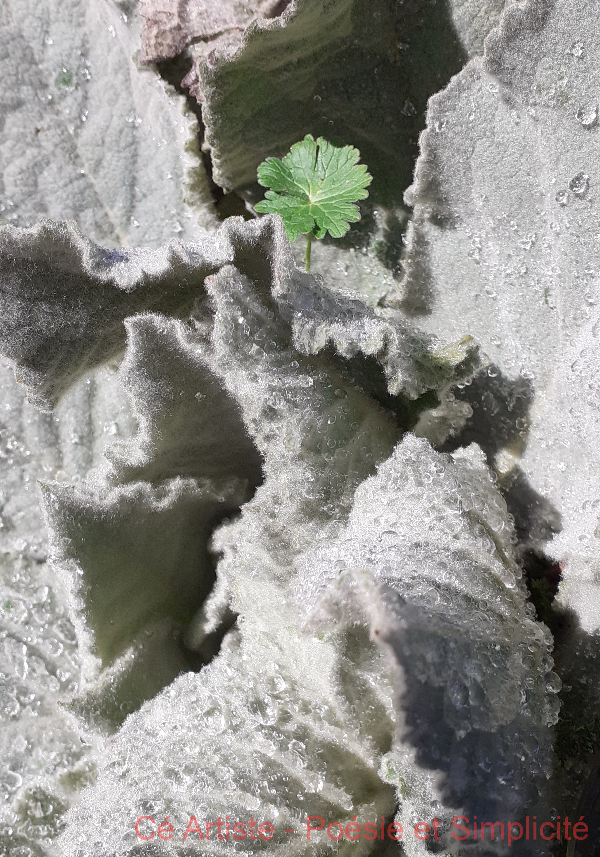 Aubrac : la plante laineuse a gardé sur son pelage des gouttes de rosée, et une feuille d’un végétal bien vert s’est faufilée en son coeur.
