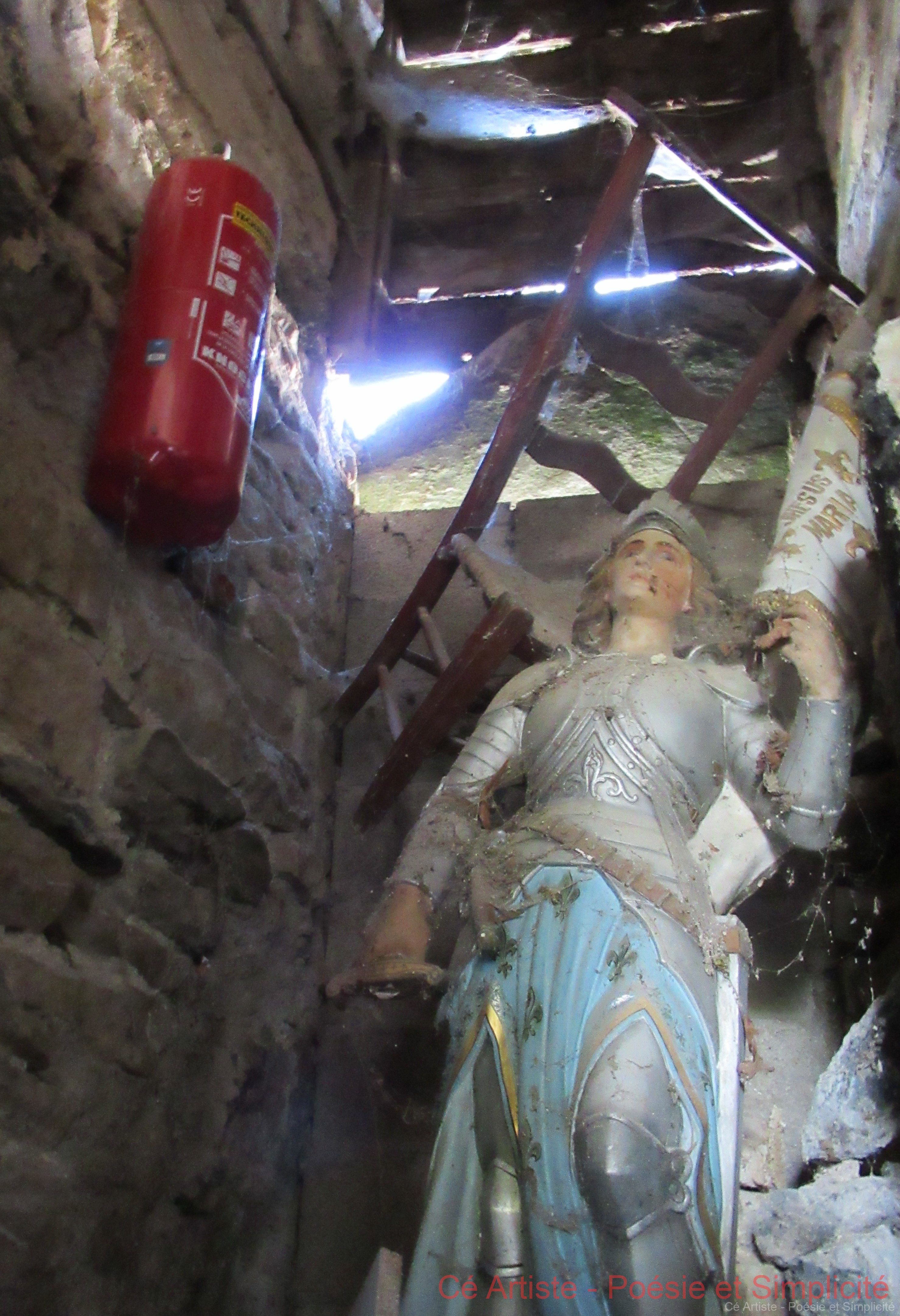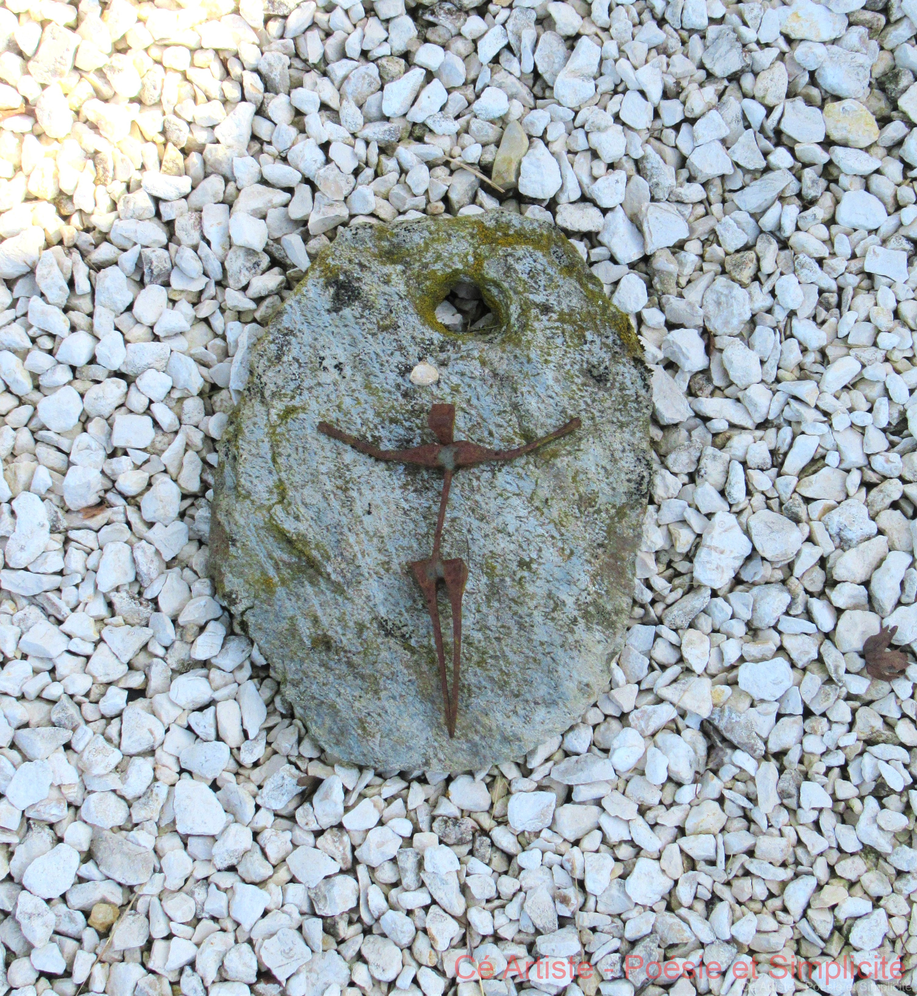 A Crozillac, je pousse une porte sous le porche de l’église : ici, on stocke …. Jeanne d’Arc, pleine de poussière et de toiles d’araignées supporte une chaise coincée derrière elle, voisine avec un extincteur. Les cimetières racontent l’histoire du lieu : exode rural, retour de guerre d’Algérie. Les tombes sont ornées d’images d’abeilles, ou de paires de boeufs. Plusieurs Christ par pierre tombale, presque toujours. C’est le premier novembre, il fait doux : le cimetière rutile de chrysanthèmes. Sur une tombe, une lauze permet à un Christ forgé en clous de savourer son repos éternel.