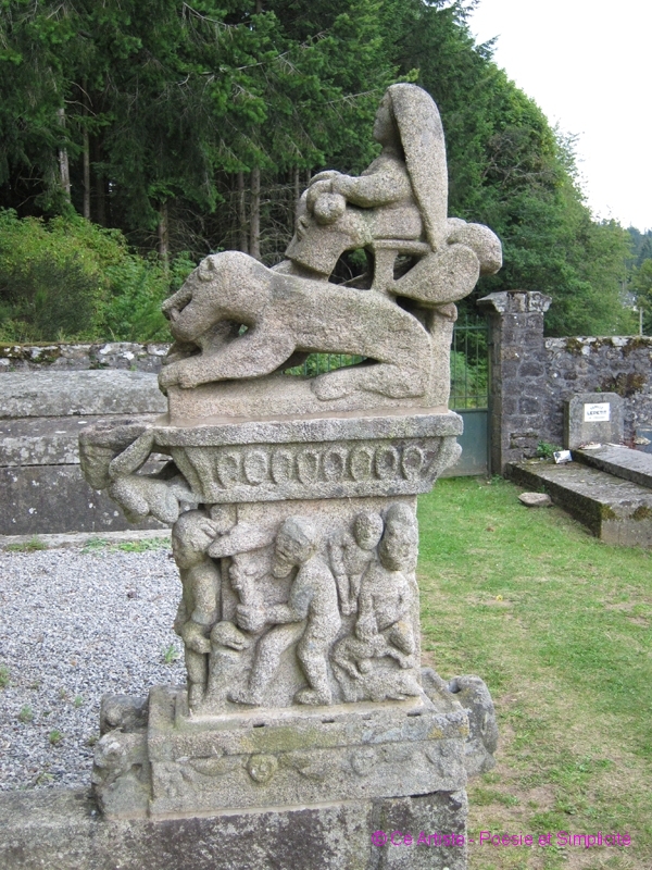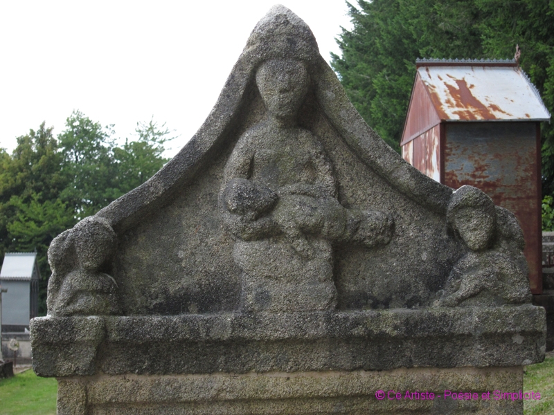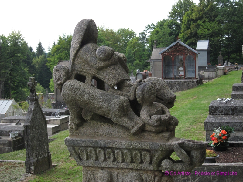 au cimetière de Ginioux, sur les pierres tombales, des personnages bercent des enfants, des bêtes fantastiques les accompagnent….
